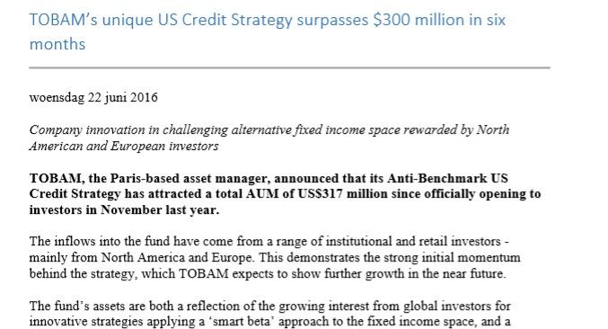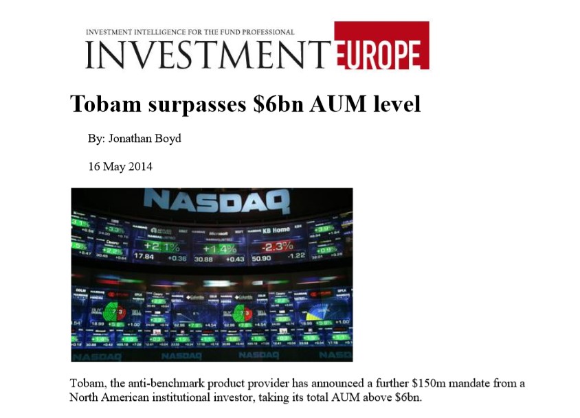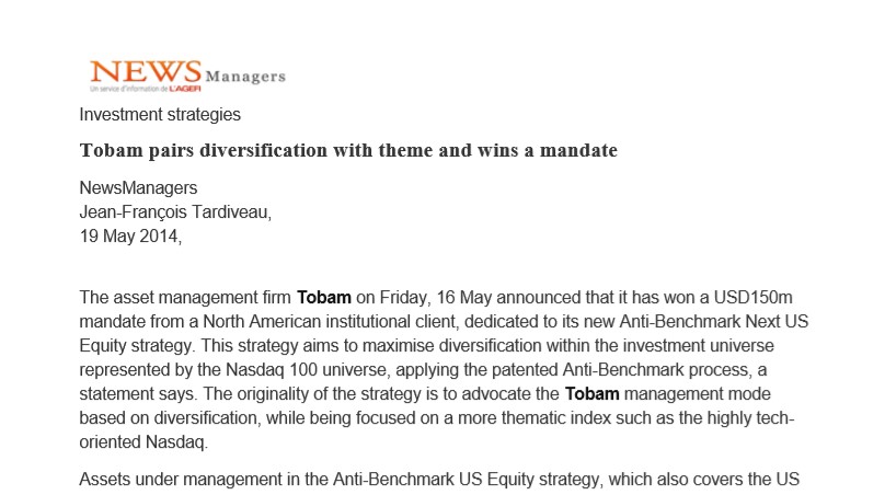 TOBAM, the anti-benchmark product provider has announced a further $150m mandate from a North American institutional investor, taking its total AUM above $6bn.