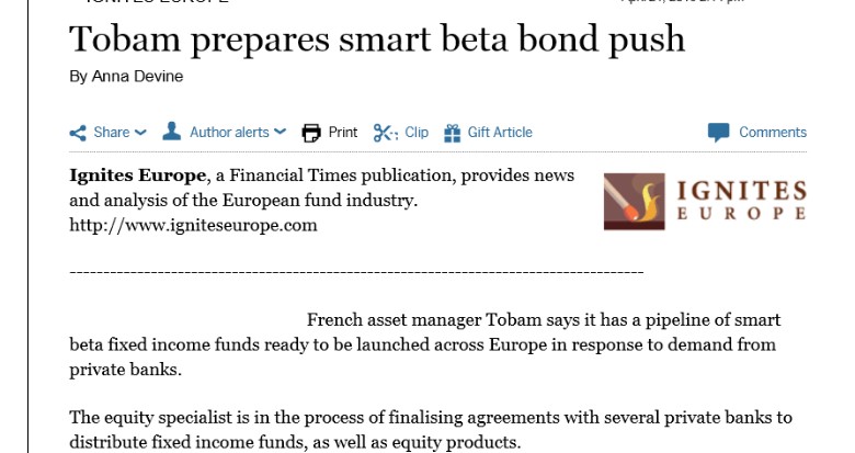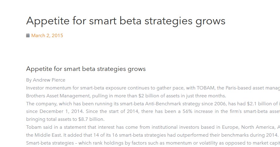 Appetite for smart beta strategies grows By Andrew Pierce Investor momentum for smart-beta exposure continues to gather pace, with TOBAM, the Paris-based asset manager spun…