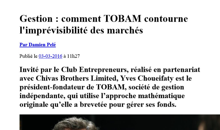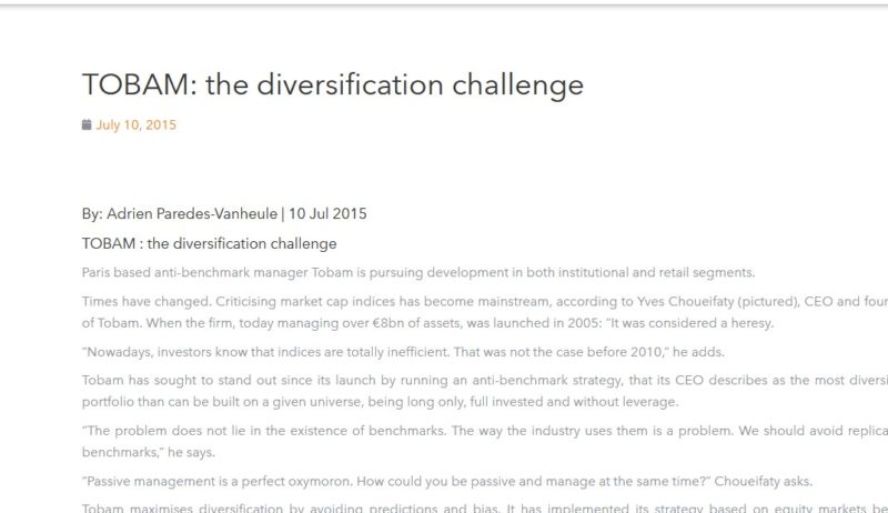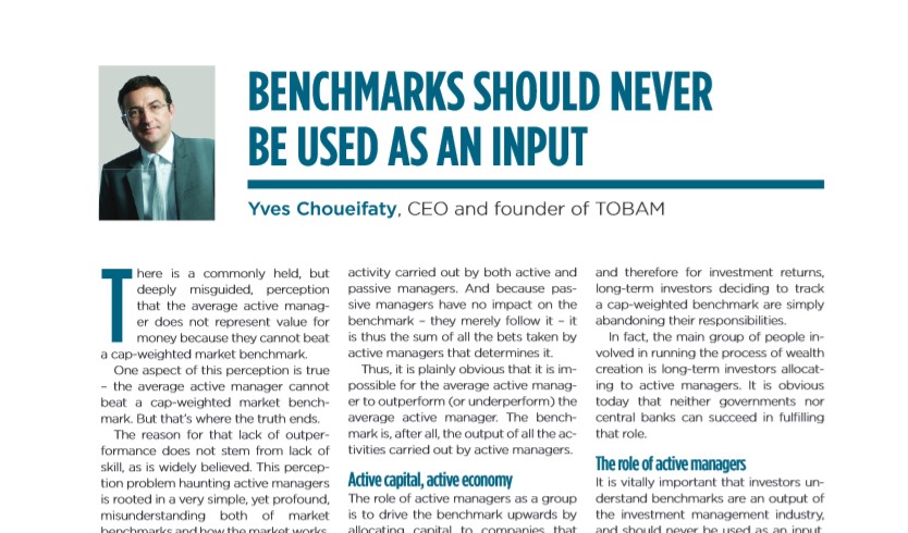Yves Choueifaty’s Face to Face Profile in FTfm by Sophia Grene: TOBAM’s President and Founder discusses the role of active managers, benchmarks, markets efficiency and…