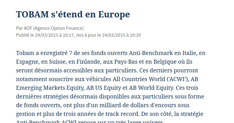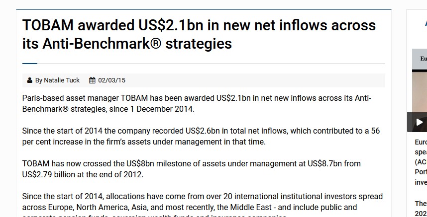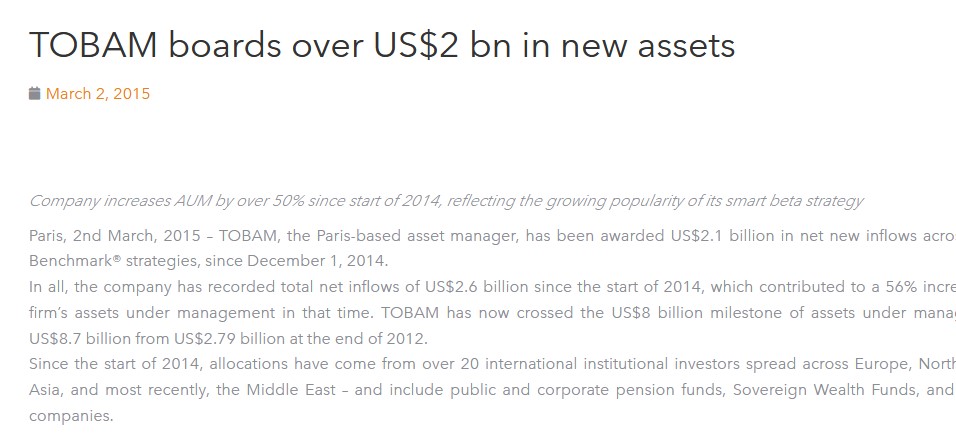 Company increases AUM by over 50% since start of 2014, reflecting the growing popularity of its smart beta strategy Paris, 2nd March, 2015 – TOBAM,…