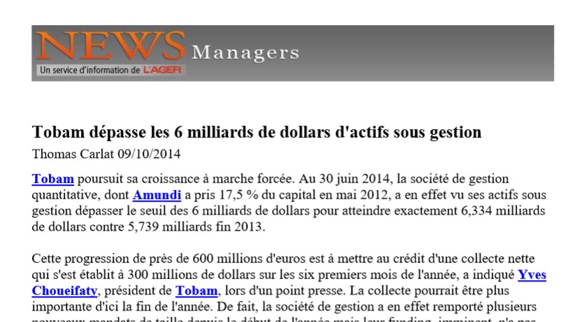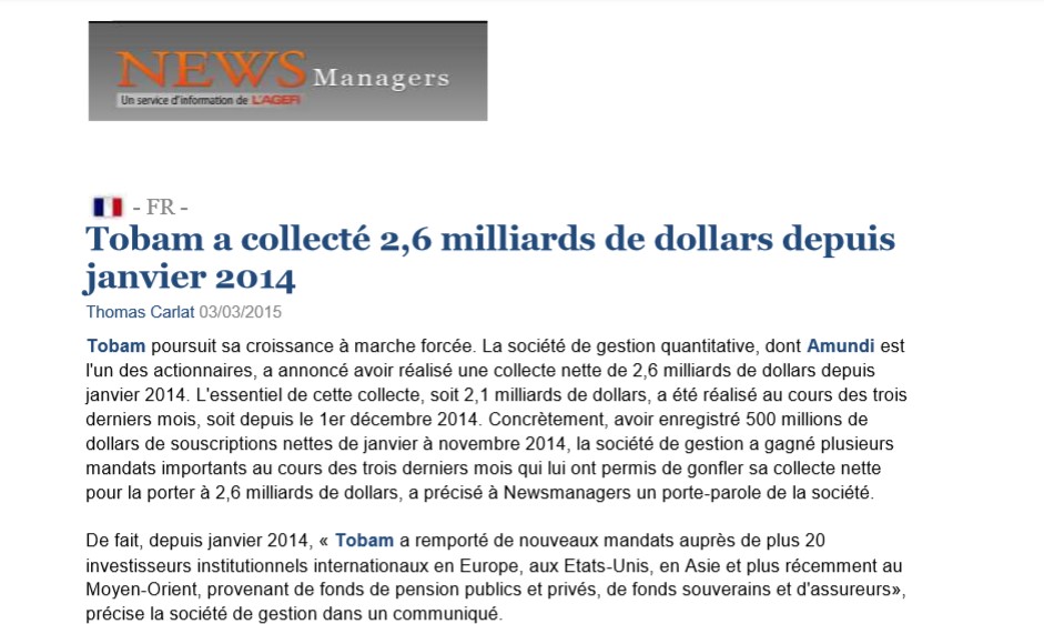 TOBAM poursuit sa croissance à marche forcée. Au 30 juin 2014, la société de gestion quantitative, dont Amundi a pris