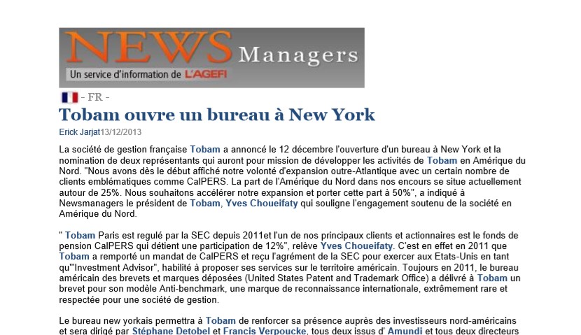 La société de gestion française TOBAM a annoncé le 12 décembre l'ouverture d'un bureau à New York et la nomination de deux représentants qui auront…