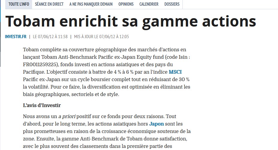 TOBAM complète sa couverture géographique des marchés d’actions en lançant Tobam Anti-Benchmark Pacific ex-Japan Equity fund (code Isin : FR0011259225), fonds investi en actions asiatiques…