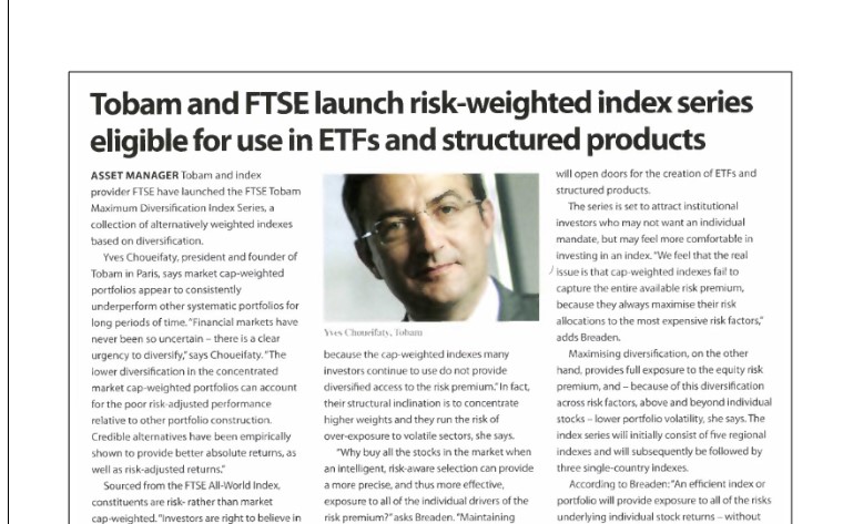 TOBAM and FTSE have launched an index series based on diversification, offering a more risk-based view than the more traditional market cap weighting.