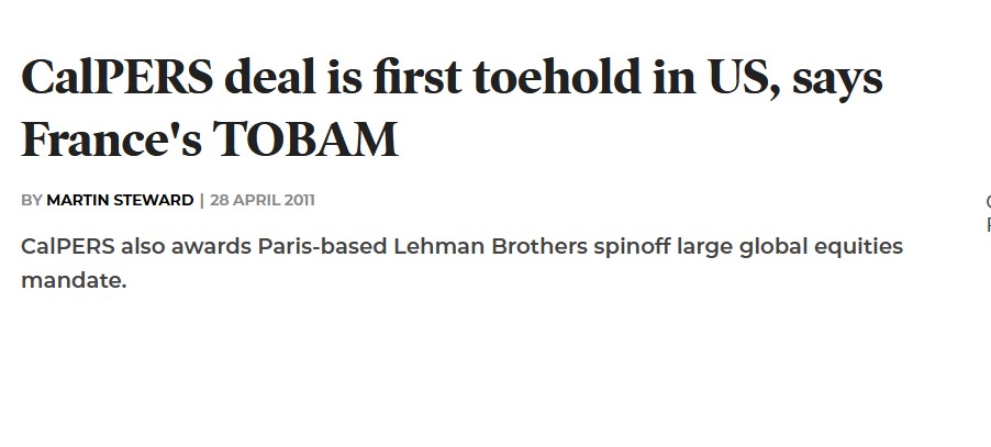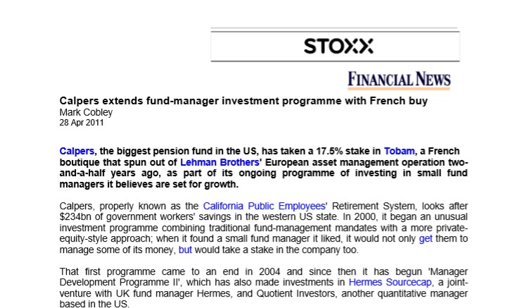 Calpers, the biggest pension fund in the US, has taken a 17.5% stake in TOBAM, a French boutique that spun out of Lehman Brothers' European…