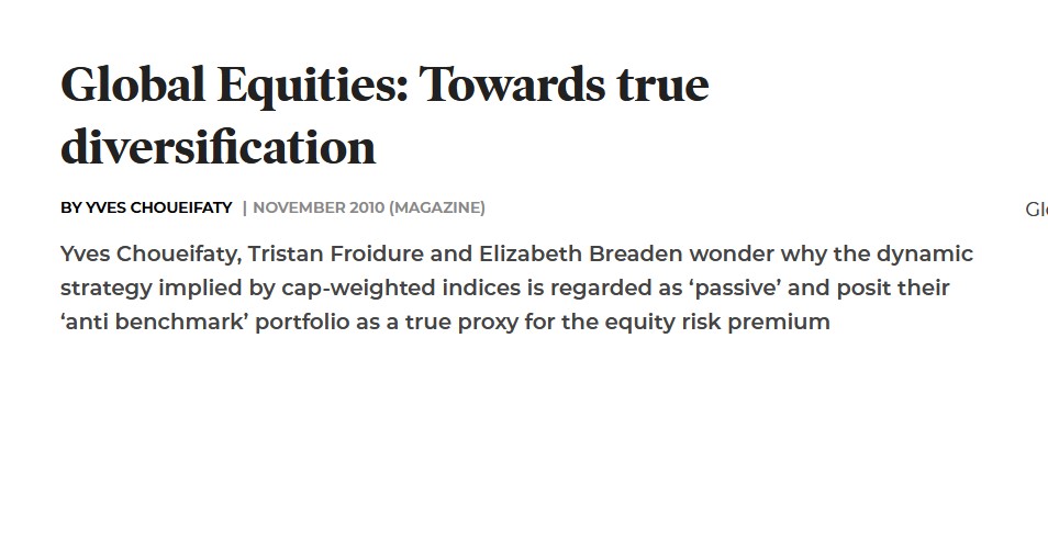 Yves Choueifaty, Tristan Froidure and Elizabeth Breaden Wonder why the dynamic strategy implied by cap-weighted indices is regarded as 'passive' and posit their 'anti-benchmark' portfolio…