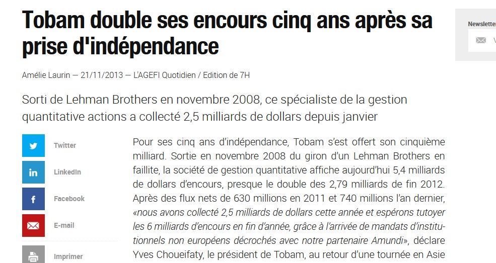TOBAM ne connait pas la crise. En 2013, la société de gestion a multiplié par deux ses actifs sous gestion. De 2,778 milliards de dollars…