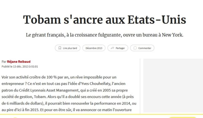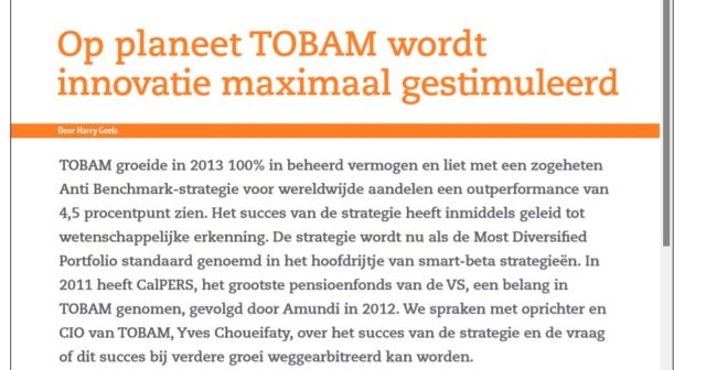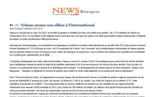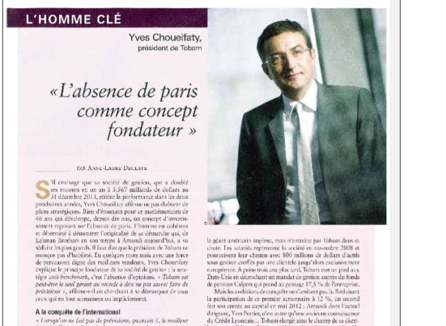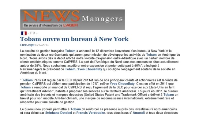 TOBAM ne connait pas la crise. En 2013, la société de gestion a multiplié par deux ses actifs sous gestion. De 2,778 milliards de dollars au 31décembre 2012, ils ont atteint 5,568 milliards douze mois plus tard. Qui plus est, grâce à un effet souscriptions nettes représentant 2 milliards de dollars, le solde représentant l’effet performance.
