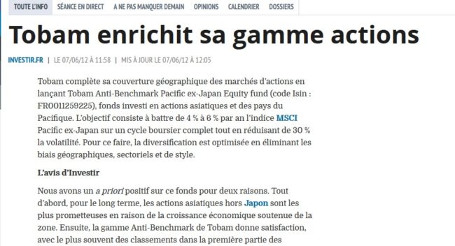 TOBAM complète sa couverture géographique des marchés d’actions en lançant Tobam Anti-Benchmark Pacific ex-Japan Equity fund (code Isin : FR0011259225), fonds investi en actions asiatiques et des pays du Pacifique.